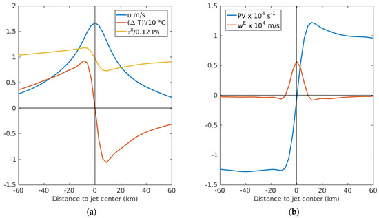 Time-averaged meridional profiles at 150 km east of the western boundary, centered on the instantaneous jet maximum, from a simulation with wind stress depending only on SST (III). (a) zonal velocity (m/s), high-pass filtered SST perturbation (scaled by a factor of 10; C), and zonal wind stress (scaled by 0.12; Pa); and (b) surface pseudo PV (scaled by ; s) and Ekman pumping (scaled by ; m/s).