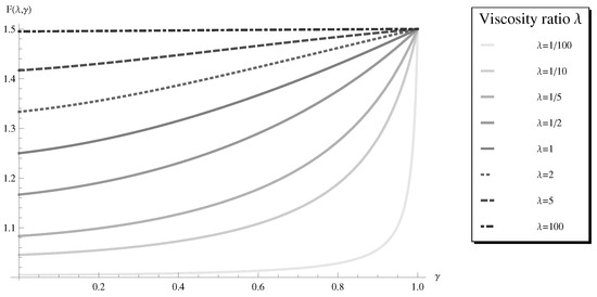 The dependence of the dimensionless drag on the volume fraction is depicted in Figure 6. In the limiting case of , the result for the solid sphere is recovered. Given the viscosity ratio λ, the dimensionless drag force decreases if the volume of the fluid coating increases. When the viscosity ratio is small and the volume fraction goes to the limit , the result is asymptotic to the fluid drop result (21) in Section 3.2.