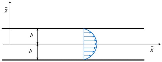 For steady Poiseuille flow, the continuity Equation (3) is verified, and the momentum Equation (4) has two scalar components, as reported below. All the quantities depend only on , except for which depends linearly on .