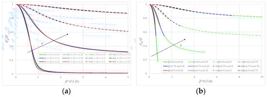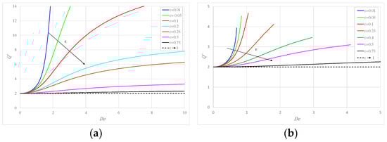 Figure 2a shows for the behavior of the flow rate per unit width as a function of Deborah number for different values of : initially increases with and then approaches a constant asymptotic value. Notably, the increase is physically limited, as eventually the flow regime becomes turbulent for high values of the pressure gradient. At the same time, for an identical value of the pressure gradient, i.e., , an increase in the amount of solvent (larger ) implies a smaller flow rate. This effect, due to a reduction in the shear thinning behavior of the fluid in laminar flow, is more marked for small values, while already for , the increase is modest with . Figure 2b illustrates the variation of the flow rate with for different and increasing values of for ; initially increases with as before, but its asymptotic value is not reached (except for = 0.75), as with there is a minimum value of to obtain the assigned value of Deborah number as detailed in [14].