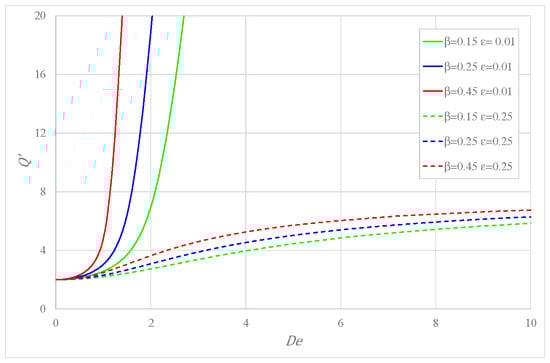 In this section, the effects of the variation of parameters describing the Newtonian solvent on the flow rate are discussed. The quantity of solvent is indirectly represented by the viscosity ratio , which varies from , when only the Giesekus fluid is present, and , when the fluid reduces to a Newtonian one. Two different values of the mobility factor are considered—one lower and one higher than 0.5—to illustrate the two possible situations described by Yoo and Choi in [7].