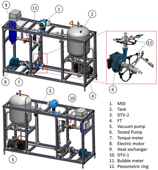 Tests are carried out on an on-purpose test bench for pump performance designed and assembled at the Engineering Department of the University of Ferrara. The closed test loop with a pressurizer described by Gülich [19] is taken as a reference for the design phase. A schematic representation of the test rig is reported in Figure 1.
