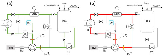 The main loop is made up of 1 1/2″ galvanized steel pipes, 3.3 mm thick. A 100 L tank ensures the reservoir during the test. The constant fluid temperature during operations is guaranteed by means of a shell-and-tube heat exchanger (HE). The tested pump is actuated by a 1.1 kW inverter-driven electric motor (EM), and a Burster (Gernsbach, Germany) 8661-5005 torque meter (TM) is interposed between the motor shaft and the pump shaft. The rotational speed is measured with a magnetic pickup that overlooks the electric motor fan. The operational point of the pump is varied using a motorized throttle valve (DTV-1) and the volumetric flow rate is measured employing an electromagnetic flowmeter Endress+Hauser (Reinach, Switzerland) Proline Promag 55S (MID). According to the ISO 9906:2012 standard [20], the pressure measuring sections are located two diameters away from the suction and the discharge flanges. Each section is equipped with a K-type thermocouple and an absolute pressure transducer: a Measurement Specialties (Hampton, Virginia) pressure sensor U5131 (range of 0–2 bar) and a US381 (range 0–6 bar) are provided for the the suction and discharge section, respectively. The measured values of pressure and temperature are the average of four equally distributed taps joint by a piezometric ring, as reported in Figure 1. The pressure transducers are arranged horizontally to prevent the air and solid particles becoming trapped in the instrument lines. Another K-type thermocouple and a Measurement Specialties Pressure sensor U5131 (range of 0–2 bar) monitor the fluid temperature and pressure in the tank. A pneumatic valve system at the top of the tank allows for the management of the pressurization of the test loop. The ambient pressure can be established by opening the vent valve while, utilizing a screw compressor and a vacuum pump, it is possible to pressurize or depressurize the loop. In addition, a SONOCHECK-ABD06 (Halle, Germany) bubble meter (BM) is installed next to the pump discharge section to evaluate the gas content inside the tested fluid. This non-invasive sensor is commonly employed for medical applications, e.g., to monitor the presence of bubbles during blood transfusions or dialysis by means of the ultrasound principle [21] or biotechnology processes [22]. The ultrasound wave emitted by the device crosses the measuring section (pipe), and depending on the transit time to reach the receptacle, an analog output is produced. Its signal is processed by internal algorithms, and it returns a signal proportional to the size of the bubbles detected. A branch from the main loop with a transparent plastic pipeline with an internal diameter of 4 mm is arranged to meet the installation requirements of the instrument. All signals from the measuring sensors and the control signals for the motorized valves are managed by an NI DAQ hardware system through software specifically developed in the LabVIEW (Austin, TX, USA) environment. Two different loop operative configurations can be alternately employed. In the “open-loop” scheme (Figure 2a), the DTV-2 is completely closed, and the fluid flows through the tank before reaching the pump suction. In the “closed-loop” scheme (Figure 2b), the tank is insulated by closing the FV and opening the DTV-2, and an additional vent valve is placed next to the MID. The closed-loop configuration is suggested to handle less volume fluid when no precise control of the internal pressure is required.