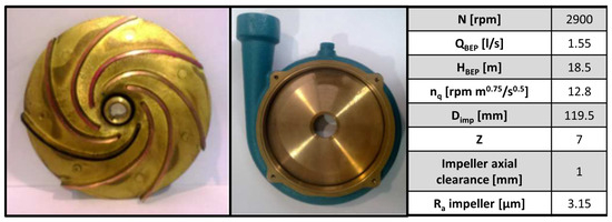 In this experimental investigation, a small commercial pump with a semi-open impeller is considered, whose depiction and main features are reported in Figure 3. The same pump was previously tested by the authors [13] with bentonite slurries, by Aldi et al. [10] and by Occari et al. [9] with kaolin slurries in a different test bench. The design speed is 2900 rpm and the performance at the best efficiency point with water returns a specific speed of 12.8. The impeller is 119.5 mm in diameter with seven blades. It is made of brass and the roughness is quantified in = 3.15 m with an Accretech (Tokyo, Japan) Handysruf+ roughness meter. The clearance between the impeller and the casing can be varied freely in the test bench, and for the actual campaign it is set to 1 mm. The pump shaft is made of stainless steel while the seal is a composite carbon-ceramic-NBR. The operating limits can be summarized in a maximum allowable pressure of 6 bar and a fluid temperature in the range of −10 °C to 90 °C.