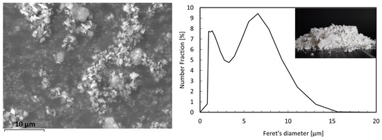 Kaolin comprises predominantly kaolinite, which is a soft mineral produced by the chemical weathering of aluminum silicate minerals like feldspar. Kaolin is one of the most versatile industrial materials, and consequently, its properties [23] and rheology [18] have long been studied. It is characterized by low reactivity to most of the industrial formulations over a relatively wide pH range, which accounts for many important applications [17]. Such characteristics as low surface charge, low surface area, white color, and particle shape make it a prime pigment and extender in paper coating and paints. One of the most important applications of kaolin is coating and filling paper. As a filler, kaolin is mixed with cellulose fibers in the wood pulp, and as a coating, kaolin is mixed with water, adhesives, and various additives and coated onto the surface of the paper. The shape and size distribution of kaolin powder are important factors in controlling many properties like brightness, viscosity, and ceramic strength and thus defining its intended application [24]. Kaolin concentration varies depending on the specific application, and it can reach 70 wt.%. Typical concentrations for the paper industry are between 30 wt.% and 40 wt.% [25]. Previous works [8,11] on performance prediction limit their analysis up to the 30 wt.% of kaolin concentration. This work extends the analysis of the non-Newtonian kaolin slurries handled by centrifugal pumps providing useful data for future analysis and developments on the pump performance modeling. A representative image with a scanning electron microscope (SEM) of the kaolin powder and the resulting Feret’s diameter distribution are reported in Figure 4. The average particle diameter is 4.4 m with a standard deviation of 3.1 m.