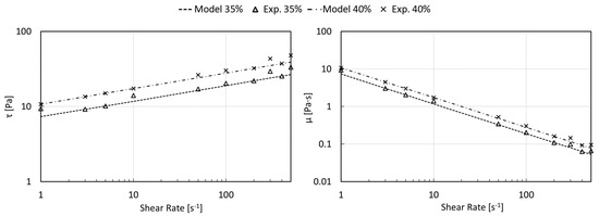 Density and rheology measurements for the NNF are performed before the test campaign as follows. Density is obtained by weighing a measuring cylinder with a capacity of 100 mL filled with the fluid, and measurement uncertainty is estimated in ±0.5 mL. Measurements are performed with the Kern ABT 100-5NM analytical scale (Kern, Balingen, Germany), each measurement is repeated five times, and the resulting average value is recorded. Rheological data are obtained with rotational rheometer Rheometric Scientific ARES-LS equipped with 25 mm titanium parallel disks with a gap between the plates set to 1 mm. Rheology characterization is carried out for the range of shear rate between 1 and 500 , and the resulting apparent shear stress and viscosity are recorded. Experimental rheology data highlight the presence of non-zero yield stress and a monotonous decreasing viscosity increasing shear rate. According to [11,26], kaolin slurry behavior can be outlined using the Herschel–Bulkley model, which is suitable for shear-thinning fluids that exhibit yield stress at zero shear rate. The relation between shear stress and shear strain rate acting on the fluid assumes the following form: