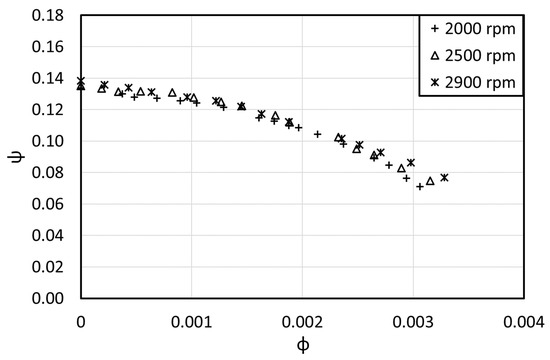 At nominal speed (2900 rpm), the maximum efficiency achieved is 50.6% and the specific speed is 12.7, which is a conventional value for radial pumps, as reported by Gülich [1]. When decreasing the pump speed, the maximum efficiency drops almost linearly up to the 36.2% for a test at 2000 rpm. Finally, affinity laws are employed to verify the similarity of operations at different pump speeds by plotting the head coefficient against the flow coefficient , as depicted in Figure 8. The similarity is considered verified since the maximum deviation obtained is at most 5% for all the operating ranges of the machines. Higher deviations are found only for a few operating points at 0.003, where the maximum uncertainty reaches 8%.