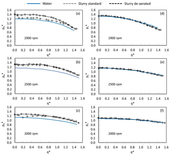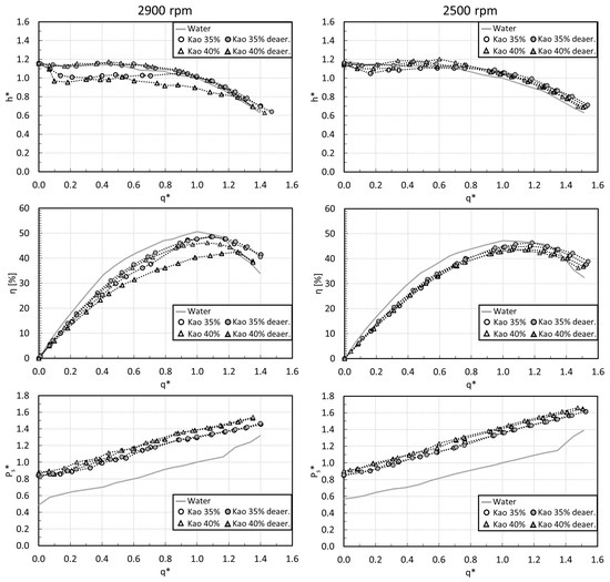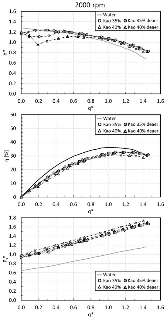 The effect of free gas in water was extensively studied in [33] for different gas volume fractions, where the same type of instability observed in the present study was detected. Pump efficiency also increases when the mixture is de-aerated. Generally, the positive effect of removing air from the fluid is clearer in part-load operations, while at the highest flow rates, the standard performance and de-aerated one are not distinguishable. The greatest increase in efficiency due to air removal is detected, where the higher performance drop was obtained in the standard condition, i.e., a test at 2900 rpm. In this condition, +8% was obtained close to the water’s best efficiency point (q∗ = 1). Solid content strongly influences standard performance. Contrary to what was found in standard conditions, the de-aerated test reported a pump head that seems to be unaffected by solid concentration. In fact, the resulting heads with 35 wt.% and 40 wt.% slurries are almost identical (Figure 10). Shaft power is not as affected as the pump head after air removal. Slight power increments, up to +3% and +8%, are found in high-speed (2900 rpm) and low-speed (2000 rpm) testing, respectively, for most part-load operations. This behavior is attributed to the lower air content in the mixture, which leads to the increase in power required to transfer energy to a greater quantity of fluid. Also for shaft power, comparing the standard test with the de-aerated one, the higher performance gap is found with the highest concentration mixture (40 wt.%). Therefore, different air content in the same fluid corresponds to different behavior only at low flow rates, when instabilities arise due to the presence of gas-locking effects. In light of this, higher kaolin concentrations promote greater air trapping and increase bubble stability. Consequently, more benefits are found in removing air from the slurry.