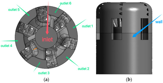 Additionally, the boundaries required for subsequent mesh generation and numerical simulation must be defined, including naming the inlet, outlet, and wall. As shown in Figure 2, the red arrow is labeled as an inlet, where drilling fluid enters and flows into the nozzles of the drill bit. The green arrows are labeled as outlets, indicating where the drilling fluid and rock cuttings flow out. Six outlets are individually named to correspond to six flow nozzles. The external surface of the wellbore is designated as the wall boundary.