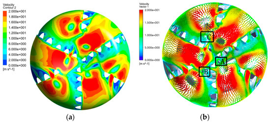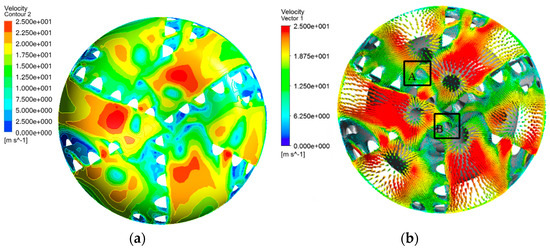 Bottom-hole flow velocity results: (a) velocity contour; (b) velocity vector cloud diagram.