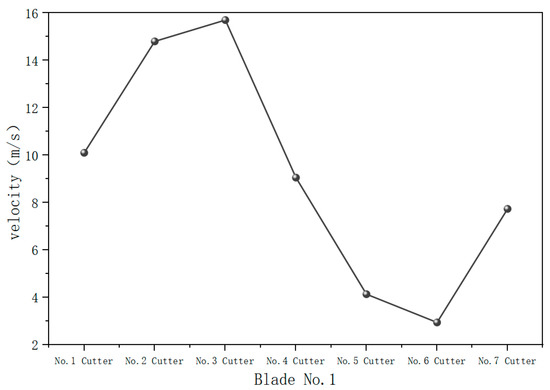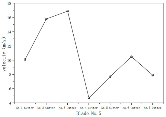 As shown in Figure 11, the surface velocity curve of blade No. 5 is concave, which is obviously different from the trend in the cutting mass curve. The surface velocity of No. 4 cutter with the highest cutting mass flow rate is the lowest, while the surface velocity of No. 1, No. 6, and No. 7 cutters with the lowest cutting mass flow rate is higher, resulting in a waste of hydraulic energy. Therefore, it is necessary to adjust the nozzle angle to optimize the hydraulic structure and achieve a reasonable distribution of hydraulic energy.