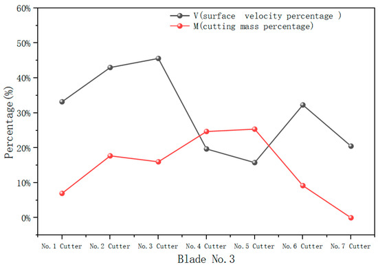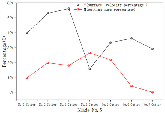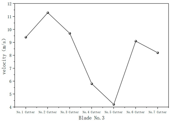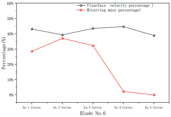 As shown in Figure 12, the surface velocity curve of No. 6 blade is generally flat, with no significant fluctuations, which differs from the distribution of the cutting mass percentage curve. Specifically, the surface velocities of No. 4 and No. 5 cutters, which have the lowest cutting mass flow rates, are higher, potentially leading to a waste of hydraulic energy. In contrast, the surface velocity of No. 2 cutter, which has the highest cutting mass flow rate, is lower. Although the surface velocity of No. 2 cutter remains sufficiently high to ensure effective cleaning and cooling, it does not align with the principle that higher cutting mass flow rates should correspond to higher surface velocities, and lower cutting mass flow rates should correspond to lower velocities. Therefore, further optimization of the hydraulic structure design is necessary to ensure the efficient and scientific distribution of hydraulic energy.