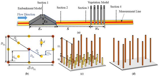 Experimental setup: (a) flume with experimental models, (b) vegetation arrangement; red and yellow color dots represent the tall and short vegetation respectively, (c) double-layer vegetation model, and (d) single-layer emergent vegetation where EH and EW are the embankment height and width, respectively, S is the open space between the embankment and vegetation, VW is the width of the vegetation, DSL and DEL are the center-to-center distance between the cylinders in the submerged layer (SL) and emergent layer (EL), respectively, and GSL and GEL are the gap between the trees in the SL and EL, respectively, the two sided arrows represent the distance or heights.