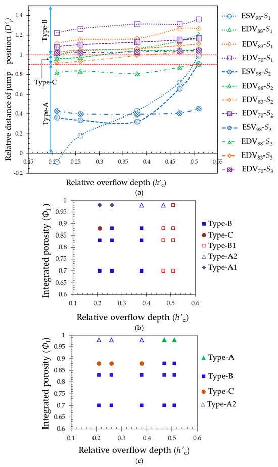 The hydraulic jump changed from Type-C to Type-B for Case EDV88 in the experimental flow range for S′1 and S′2 (Figure 3b,c and Figure 4b). The Type-B1 jump was observed only for the highest value of h′c with the minimum spacing (Figure 3c). But there was no Type-B jump while the spacing was maximum (S′3). In addition, the Type-A jump was formed for 0.21 ≤ h′c ≤ 0.47, and only Type-C was observed for h′c = 5.1 (Figure 3d).