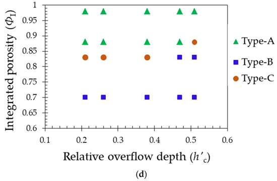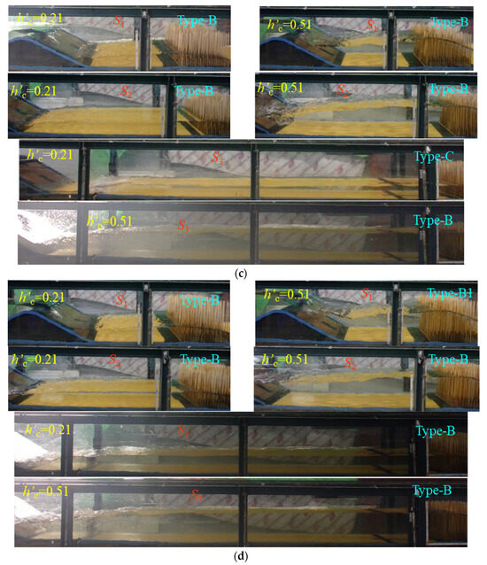 The hydraulic jump positions in relation to the flow circumstances for all of the experimental cases are presented in Figure 3. Jump types are classified with respect to the value of the relative distance of the jump position D′j (=Dj/Si,) from the vegetation model to upstream. Type-A, Type-B, and Type-C are classified according to the values D′j < 0.9, D′j > 1, and 0.9 < D′j < 1, respectively, whereas D′j < 0 indicates that the jump starts inside the vegetation, not within the space between the vegetation and the embankment model. The value of D′j changes with changing the h′c, S′I, and ΦI, respectively. Figure 3b–d show the flow type changes with respect to ΦI and S′i. Figure 4 shows some real photographs of the flow types in the experimental scenario.