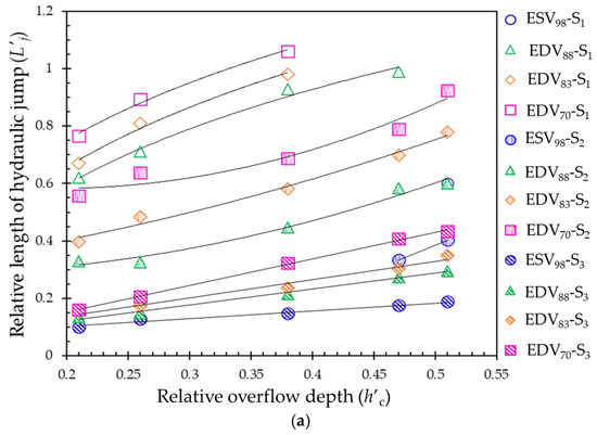 Figure 5a shows that L′j increases with increasing h′c and decreasing ΦI. The maximum L′j was observed in Case EDV70 and the minimum in Case ESV98 for each value of S′i. The graph shows that the parameter value decreases with the increasing value of S′i in a specific case. The changing trends of the parameter are also clear in Figure 5a. It was increased logarithmically, exponentially, and linearly for S′1, S′2, and S′3, respectively, while the jump length covered around 15–40% of the open space. The trend was exponential when the jump length covered around 35–80%, and it became logarithmic when the length of that S covered started from 60%.