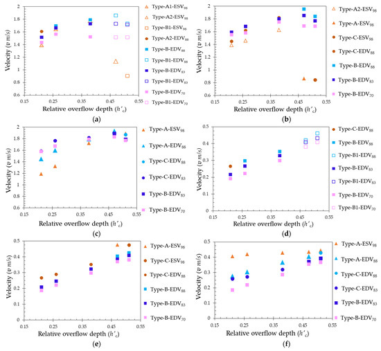 It is observed from Figure 6a–c that the velocity before the hydraulic jump is the minimum in Case ESV98 compared to the other cases, which varied between 0.85 and 1.25 m/s. On the other hand, the values change from 0.33 to 0.42 m/s, which was found to be the maximum in the downstream of a hydraulic jump in comparison to other experimental cases. The velocity in the double-layer vegetation cases varied from 1.42 to 1.93 m/s in the upstream, while it was between 0.18 and 0.47 m/s in the downstream of the hydraulic jump. The v grew both upstream and downstream of the hydraulic jump as the h′c increased. Figure 6 shows that the v in the upstream grew as the jump changed its type from A to C and later to B. In contrast, as its type changed in the same sequence, it declined downstream of the jump. Type-B had the lowest velocity downstream of the jump. It is observed that v decreased as the open distance between the E and V increased.