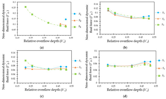 The dynamic fluid force (FD) was estimated in Section 3 (Figure 1a) to understand the impact of V on fluid force. The tail-water depth in this section is sufficient when the hydraulic jump was far ahead of V, and this parameter was estimated only for these cases. The parameter values were not considered when the jump position was within or very close to V. The non-dimensional dynamic fluid force F′D for individual V models is represented in Figure 7.