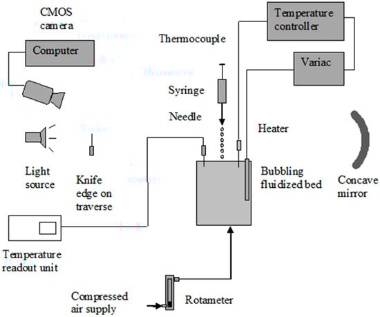 The schlieren imaging system comprised a large focal length (f = 6D), a 200 mm diameter (D) concave mirror, a light source, a knife edge, and a high-speed camera. The mirror was mounted on a vibration-resistant aluminium frame. A microscope arc lamp (12 V DC) mounted on an optical table was used as the light source and placed at the focal length of the mirror. The focal point was ascertained by carefully positioning the light source until a clear view of the bulb filament was obtained on a white background. A knife-edge device was positioned on a precision optical traverse at this focal point. After the focal point was fixed, a CMOS camera (Dantec Dynamics, XS-3, IDT Vision, Tallahassee, FL, USA) (5) was placed at this position fitted with a 100 mm focal length lens (Tokina, Tokyo, Japan), ensuring the proper alignment of the centre-point of the camera with the incident light ray. The brightness and contrast of the image was controlled by adjusting the knife-edge device position and cutting the incident light ray on camera. The fluidized bed set-up was placed closed to the mirror and covered from all sides to prevent any unwanted air draft.