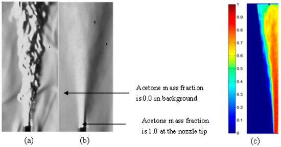 An acetone mass fraction of 1.0 was assigned at the nozzle tip (Figure 2b) with the brightest pixel intensity (255), and a mass fraction value of 0.0 was assigned to the background outside the jet envelope. A linear calibration curve was therefore obtained with background intensity corresponding to 100% air or 0% acetone and maximum pixel intensity corresponding to 100% acetone or 0% air.