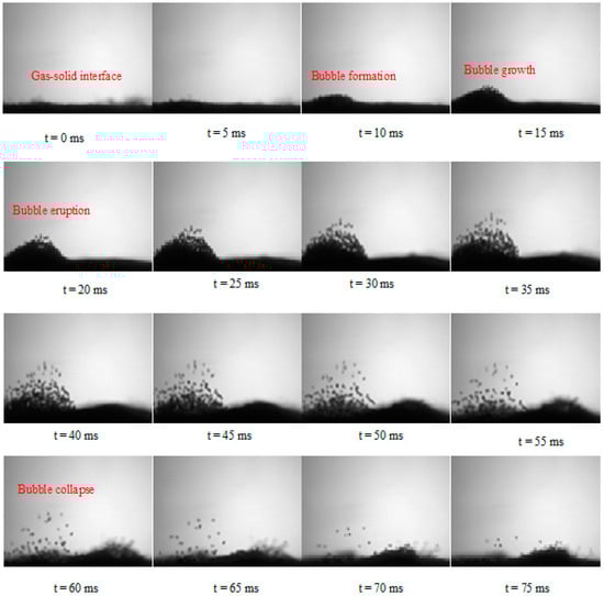 Eruption of bubbles at the gas–solid interface in the free board region of bubbling fluidized bed, leading to suspension of particles (1000 fps).