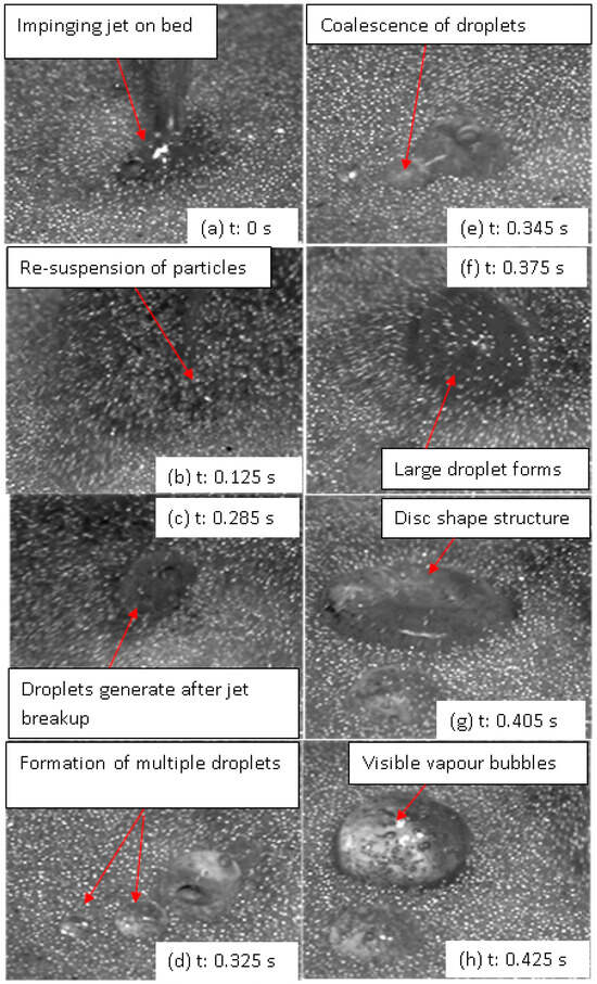 Impingement of the acetone jet on the hot bubbling fluidized bed involving vaporization was captured with high-speed imaging. Figure 5a indicates the impact of a jet on the solid particles carried out at We ~ 13. While colliding with the solid particles, the liquid jet dissipates kinetic energy and undergoes vaporization. Eventually, the jet breaks up into multiple smaller droplets. Smaller droplets evaporate instantaneously with the fast release of vapour which resuspends the solid particles around the jet (Figure 5b). Figure 5c,d show multiple droplets generated due to the breakup of the jet. Some of these droplets coalesce (Figure 5e) and form larger droplets (Figure 5f). These large droplets levitate due to the generation of a thin vapour film at the contact region with hot particles, which was also reported by Gehrke and Wirth (2009) [16] in their droplet–particle interaction experiments involving water, ethanol, and FCC particles.
