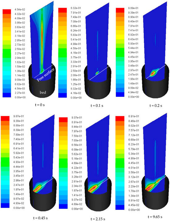 Figure 8 presents the gradual spread of the vaporization zone on the bed surface at the point of jet impingement. In the CFD framework, the impinging jet was modelled as numerous discrete droplets which were added at each time-step to match the liquid mass flow rate defined in Table 2. With time, more and more vaporization occur (t = 0 to 0.45 s) on the bed surface which eventually leads to the formation of a near uniform concentration field on the bed surface (t = 2.15 s to 9.65 s).