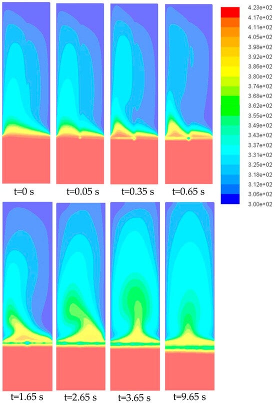 Prior to jet injection (Figure 6a), the hot air plume noted in the freeboard region occurred due to the hot fluidizing gas as well as the natural convection of the surrounding air. Due to the large temperature difference, convection currents were established in the freeboard region. The plume was apparently turbulent in nature and had visible eddies in it (Figure 6a). The larger turbulent structures contained more energy and were therefore more prominent near the bed surface due to a higher temperature difference and higher velocity of hot air. However, away from the bed surface, these structures became relatively weak due to the decreasing driving force, i.e., temperature gradients.