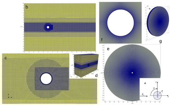 - Curvilinear, orthogonal O-type (Figure 1e–g; used here and below the abbreviation OM) with a dimension of ( cells) in the x, y, and z directions, respectively. The length of the computational domain in the streamwise direction is , and in the spanwise direction, . The grid nodes are radially relaxed from the cylinder toward the outflow boundary with the dimensionless height of the first cell being and an expansion coefficient in the radial direction of .