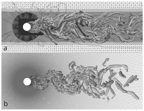- Lysenko, D.A.; Ertesvåg, I.S.; Rian, K.E. Large-eddy simulation of the flow over a circular cylinder at Reynolds number 3900 using the OpenFOAM toolbox. Flow Turbul. Combust. 2012, 89, 491–518. [Google Scholar] [CrossRef]