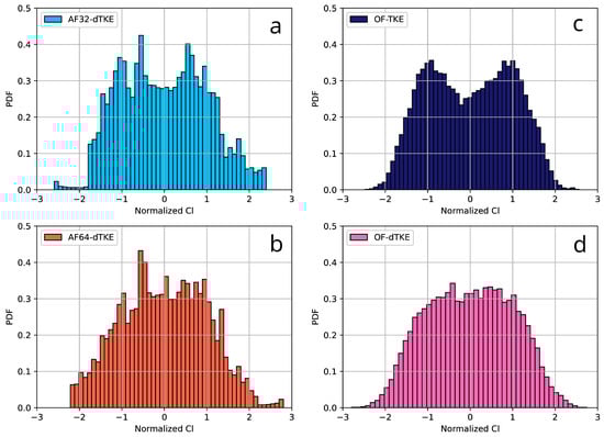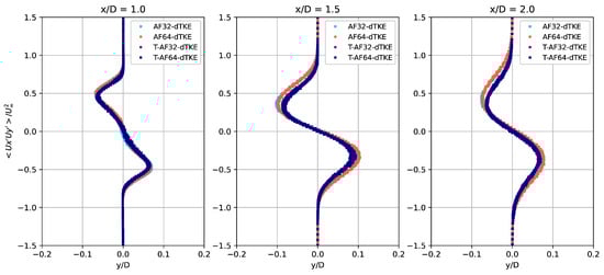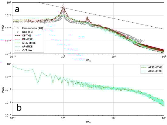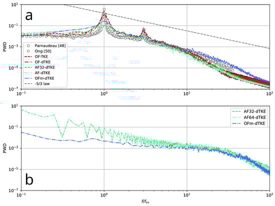 - Investigation of LES and related numerical methods using single-precision arithmetic, which is also due to several factors. The most important is the possibility of the more efficient use of computational resources: on the one hand, numerical methods using SP arithmetic use less RAM and, as a rule, provide a small performance gain (≈10–20%) when using classical CPUs. On the other hand, they allow for achieving significant acceleration on graphics accelerators, which are usually optimized for single-precision calculations, as well as on hybrid CPU–GPU systems.As mentioned above, OF provides the ability to perform simulations using mixed-precision arithmetic, SPDP. To test it, another special run (OFm-dTKE) was performed using the O-type grid. In this case, the problem was set up as closely as possible to match the AF32-dTKE and AF64-dTKE runs. On the one hand, the predicted integral flow characteristics (Table 2) converge with a small variation to the data obtained by AF32-dTKE and AF64-dTKE, which indicates the reasonable consistency of the two numerical platforms. On the other hand, the numerical method implemented in OF, even for the SPDP case, has a smaller numerical diffusion, which is clearly seen in Figure 13, where the one-dimensional energy spectra are compared. Numerical dissipation is clearly visible for the AF32-dTKE and AF64-dTKE runs. It should be noted that it was not possible to obtain a final physical solution using OF with single-precision arithmetic (similarly to Brogi et al. [32]). Most likely, this is due to the fact that the linear algebra algorithms implemented in OF are more sensitive to high-frequency perturbations due to round-off errors. It is also worth emphasizing that in the present work, the dynamic differential sub-grid scale model for the kinetic energy was used, which is strictly dissipative under the condition that the turbulent viscosity is positive [35], i.e., it makes a certain contribution to the suppression of high-frequency oscillations, which, together with the algebraic multigrid method implemented in AF, allows for the effective simulation of the turbulent flows with single precision.