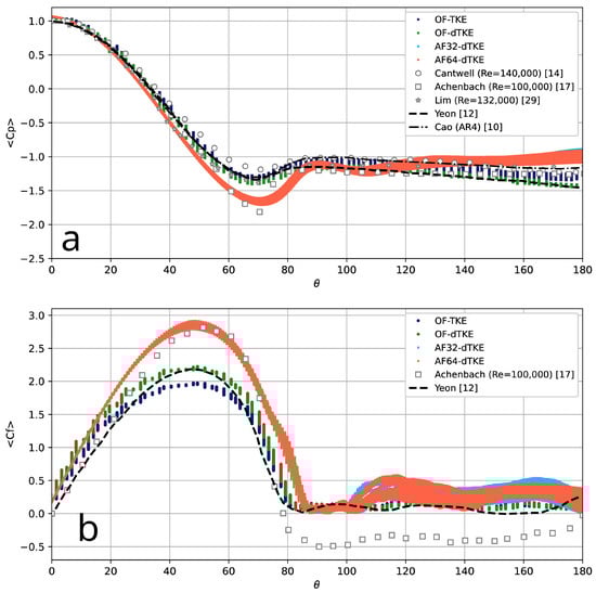 - Achenbach, E. Distribution of local pressure and skin friction around a circular cylinder in cross-flow up to Re = 5 × 106. J. Fluid Mech. 1968, 34, 625–639. [Google Scholar] [CrossRef]