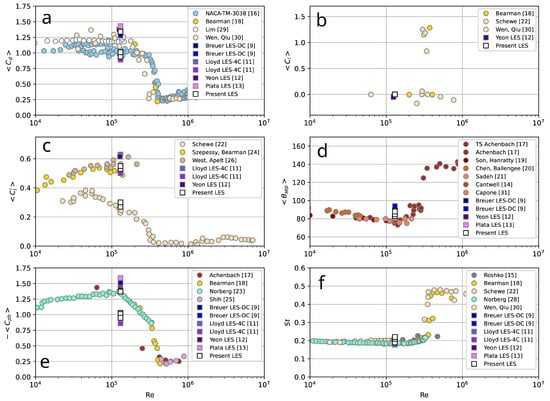- Parnaudeau, P.; Carlier, J.; Heitz, D.; Lamballais, E. Experimental and numerical studies of the flow over a circular cylinder at Reynolds number 3900. Phys. Fluids 2008, 20, 085101. [Google Scholar] [CrossRef]