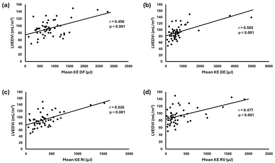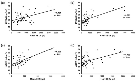 The DF correlated with the LVESVi (r = −0.256, p = 0.048), and the DE correlated with the LVEDVi (r = 0.385, p = 0.02), LVESVi (r = 0.545, p < 0.001), and LVEF (r = −0.323, p = 0.029). The maximum KE of the DF, DE, and RI correlated with the LVEDVi (r = 0.317, p = 0.014; r = 0.518, p < 0.001, Figure 2a; and r = 0.289, p = 0.025, respectively). The maximum KE of the DE and RI correlated with the LVESVi (r = 0.447, p < 0.001, Figure 2b; r = 0.313, p = 0.015, respectively). Only the maximum KE of the RV correlated with the LV masses indexed (r = 0.368, p = 0.004). The correlations of the mean KE of the DF, DE, RI, and RV with LVEDVi are presented in Figure 3. The correlations of the mean KE of the DF, DE, RI, and RV with the LVESVi are presented in Figure 4. The maximum and mean RV KE were also associated with surgical referral (r = 0.438, p = 0.002; and r = 0.371, p = 0.009; respectively).