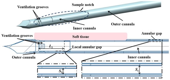 In the present study, a typical structure is adopted, which consists of a coaxial inner cannula and outer cannula, as shown in Figure 1. Driven by an applied vacuum pressure at the end of the inner cannula, air is supplied from the annular gap, which enters the inner cannula through ventilation grooves to propel the extraction of the tissue.