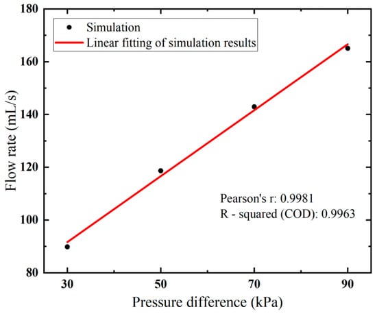 Higher flow velocity results in a larger flow rate, as expected. Notably, a near-linear relationship between the flow rate and vacuum pressure is observed in Figure 6. By increasing the applied vacuum pressure from 30 kPa to 90 kPa, the flow rate rises from 89.81 to 165.05 mL/s.