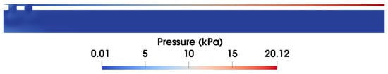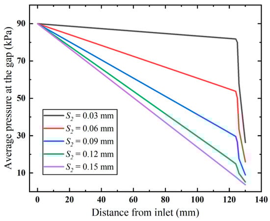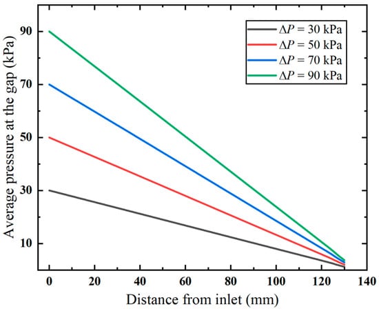 Additionally, it is observed in the pressure distribution (shown in Figure 7) that the gap between the inner and outer tubes, i.e., the annular gap, which is the narrowest path of the fluid flow, exhibits pronounced pressure changes. The pressure distribution in this area under varying vacuum pressures is compared in Figure 8. Clearly, the pressure decreases linearly with the flow distance, which aligns with the Darcy–Weisbach formula, indicating the pressure loss along the narrow gap. Notably, the higher applied vacuum pressure has a greater loss of pressure, since the increased fluid velocity causes higher energy loss.