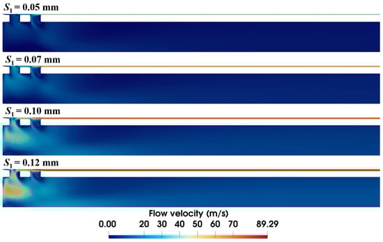 It is observed in the previous section that the narrow annular gap is the main cause of the energy loss of airflow. The quantified effect of the gap (i.e., S1) is further investigated in this section. Figure 9 shows that the size of the annular gap has a significant influence on the velocity distribution of airflow. Narrower gaps reduce overall flow velocity, with maximum velocity dropping from 89.3 m/s to 52.6 m/s as S1 decreases from 0.12 mm to 0.05 mm. Meanwhile, wider gaps have more air flow through the front ventilation groove and present a different airflow distribution. Distinct high-velocity airflow occurs at S1 = 0.12 mm and 0.10 mm but nearly vanishes at S1 = 0.05 mm.
