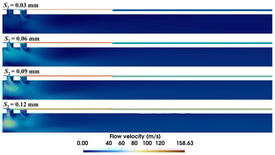 The diameter of the anti-winding structure directly relates to the local annular gap in the sample notch. As shown in Figure 11, expanding the diameter progressively shrinks the high-velocity area at the front end. In particular, at the diameter of 4.34 mm (i.e., S2 = 0.03 mm), the high-velocity area vanishes, and the flow velocity in the annular gap is also markedly decreased.
