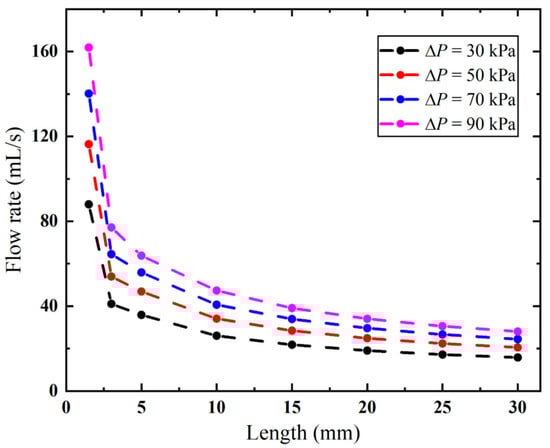 As demonstrated in Figure 15, the biopsy needle has a lower flow rate with a longer anti-winding structure. This structure exhibits optimal flow performance when its length remains below 2.2 mm, as this configuration facilitates efficient airflow entry through the rear ventilation groove, thereby maintaining high flow rates. However, once the lengthened structure covers both ventilation grooves, the flow rate sharply decreases from 161.89 to 77.06 mL/s when the vacuum pressure is 90 kPa. Thereafter, the effect of the varied length becomes small, since the flow rate only decreases from 63.77 mL/s to 27.99 mL when the length is increased from 5 mm to 30 mm. When the length is 30 mm, the flow rates remain consistently low under all pressures.