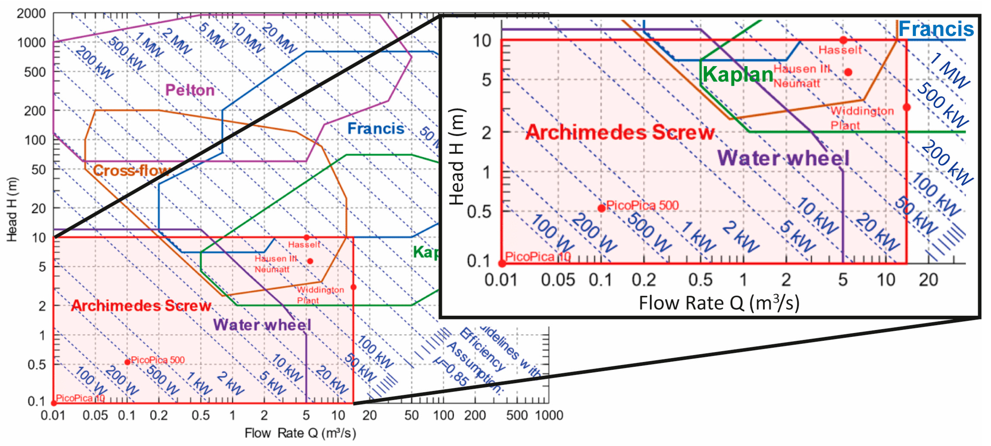 - Simmons, S.C.; Lubitz, W.D. Archimedes screw generators for sustainable micro-hydropower production. Int. J. Energy Res. 2021, 45, 17480–17501. [Google Scholar] [CrossRef]