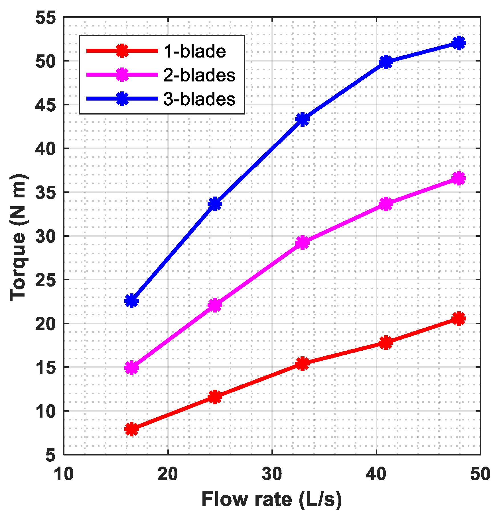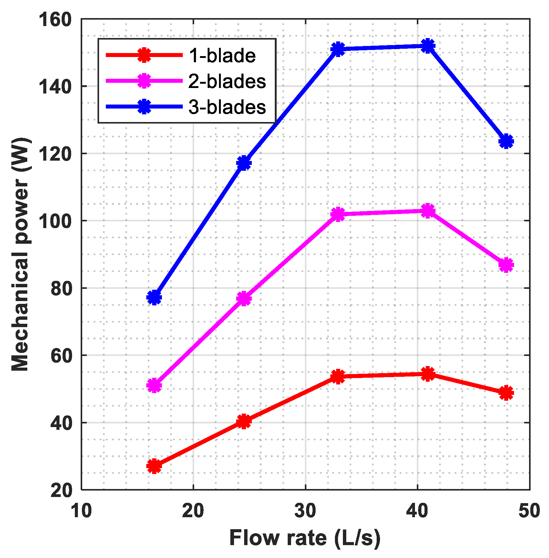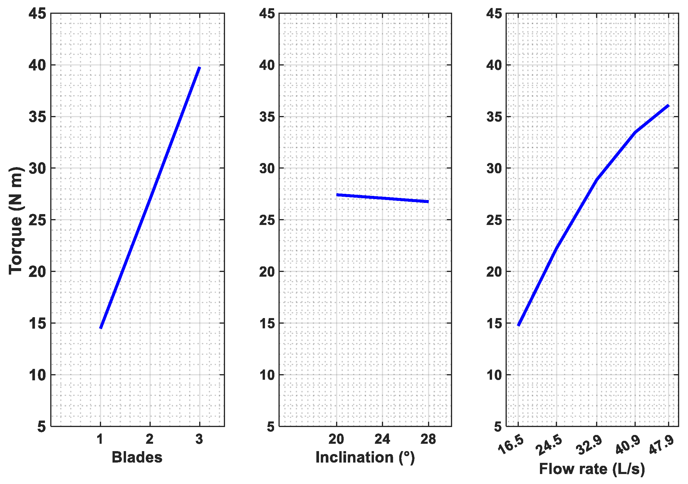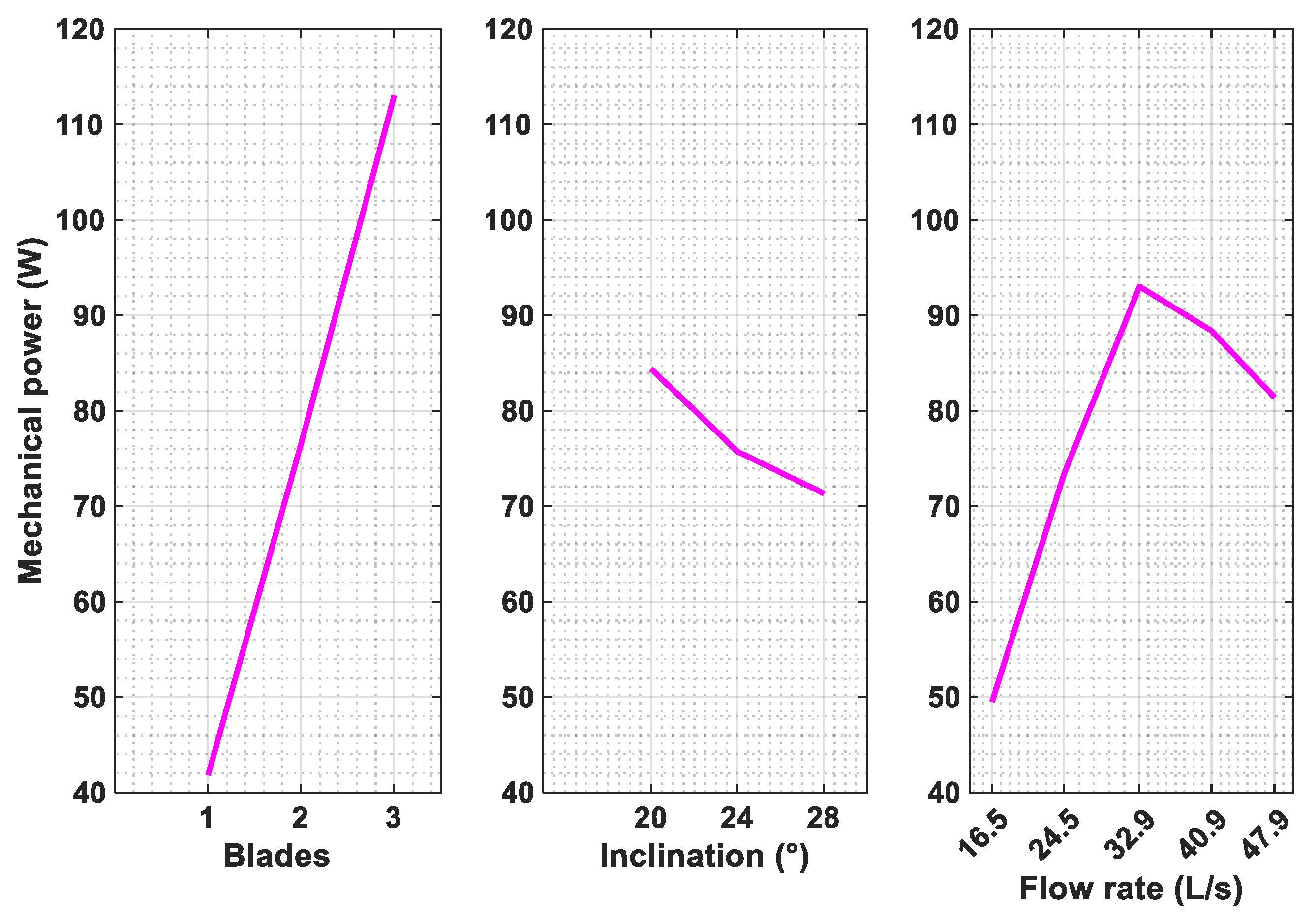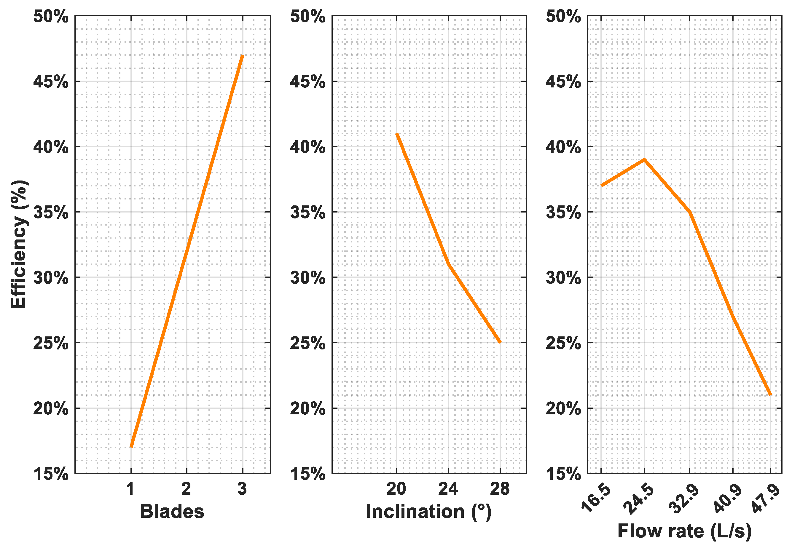 Number of Blades | Inclination Angle | Flow Rate (L/s) | ||