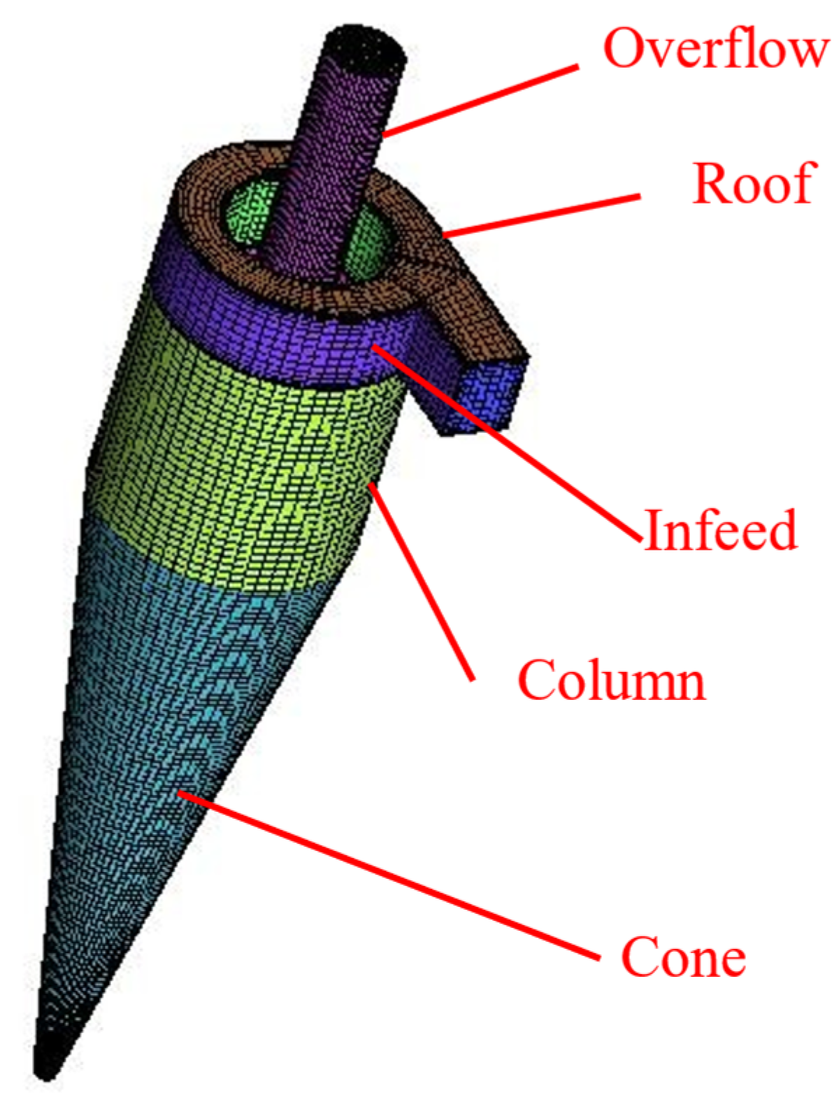 - Li, F.; Li, P.; Wang, Y.; Guo, D.; Yang, H.; Han, H.; Liang, R. Numerical analysis and experimental research on the influence of column structure on the classification performance of hydrocyclone. Alex. Eng. J. 2025, 120, 271–286. [Google Scholar] [CrossRef]
