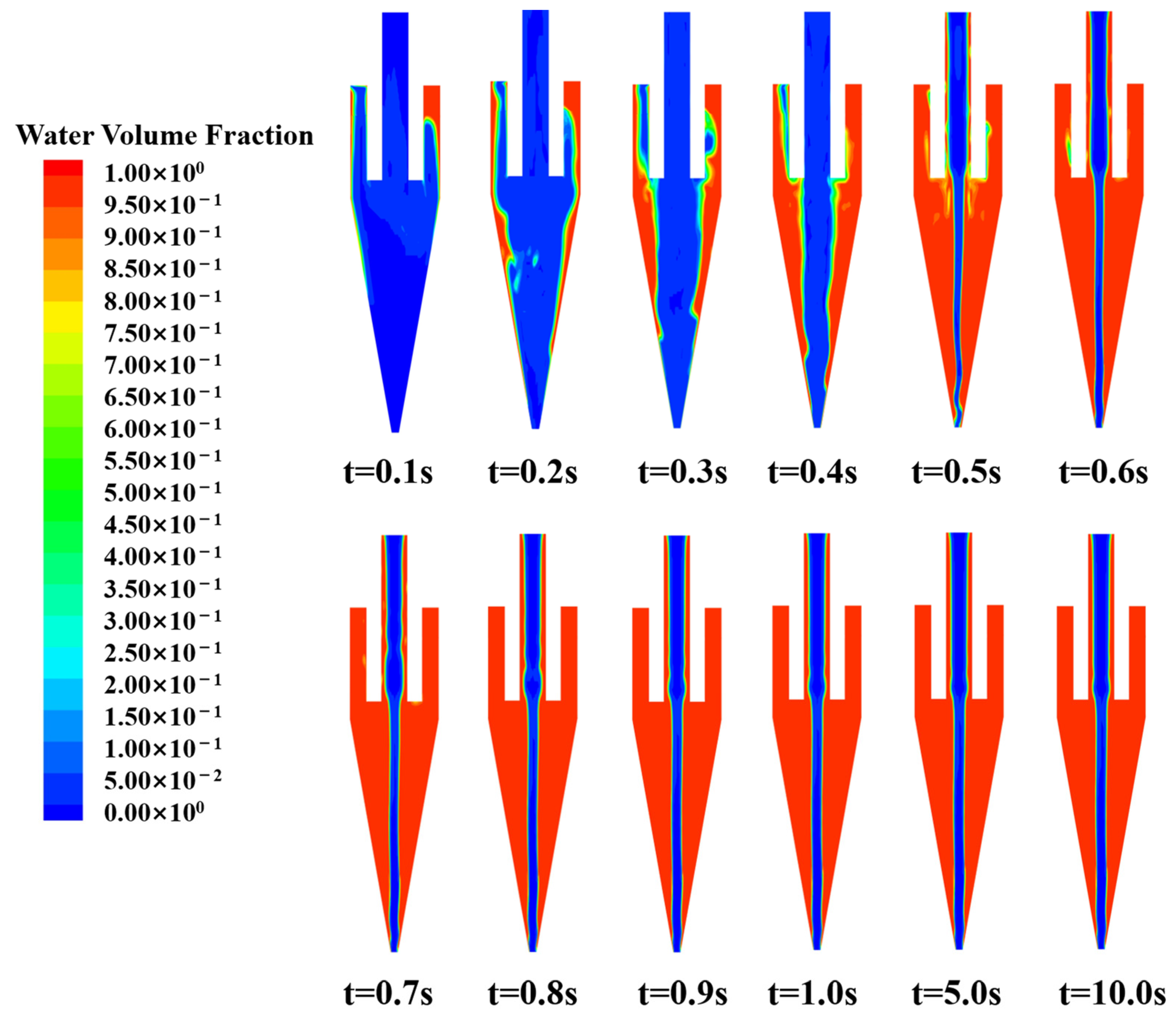 - Neesse, T.; Dueck, J. Air core formation in the hydrocyclone. Miner. Eng. 2007, 20, 349–354. [Google Scholar] [CrossRef]