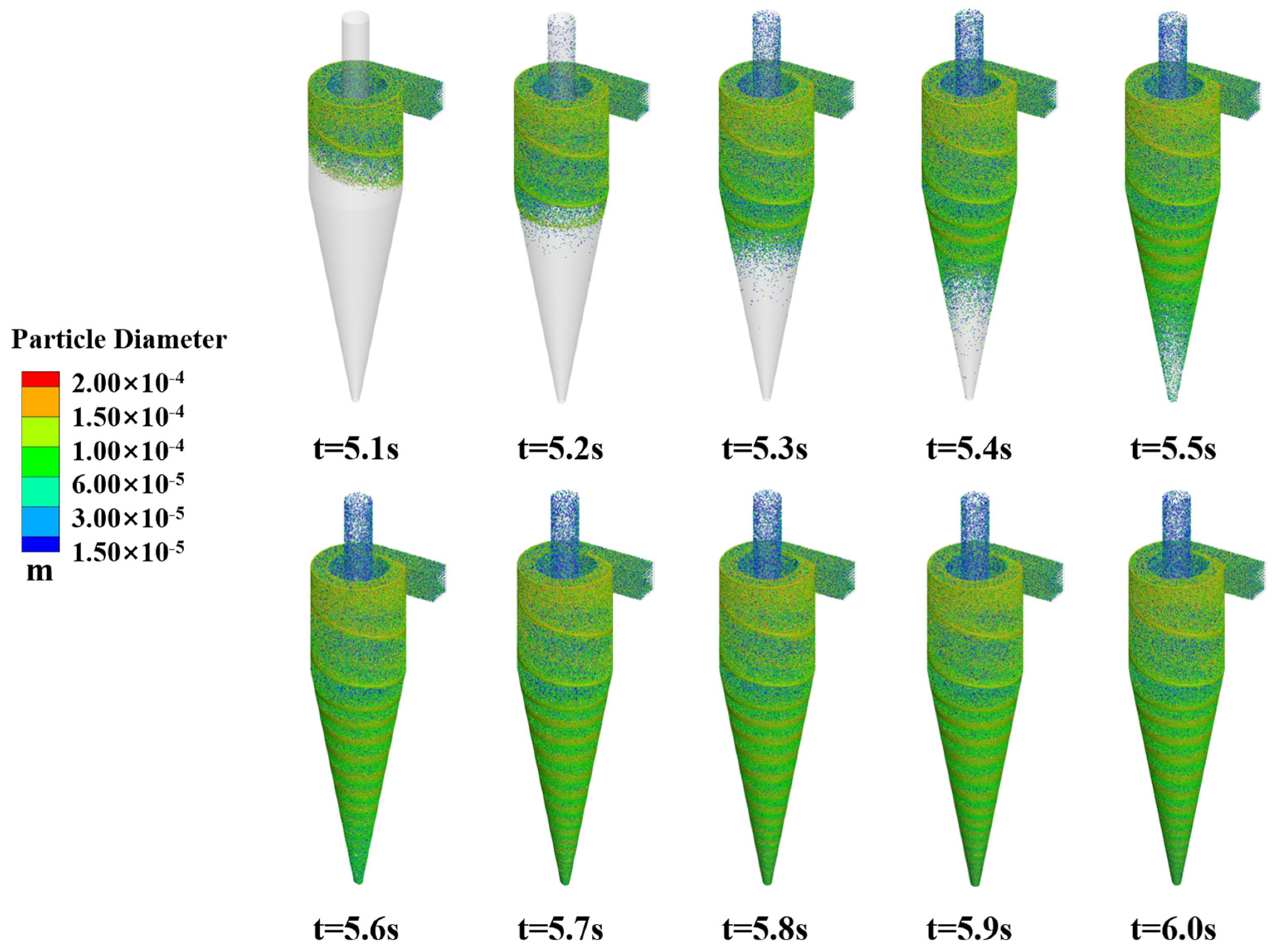 - Yu, F.; Chen, B.; Liu, Q. Study on the elimination of cyclone air column to improve classification efficiency. China Powder Sci. Technol. 1999, 5, 43–44. [Google Scholar]