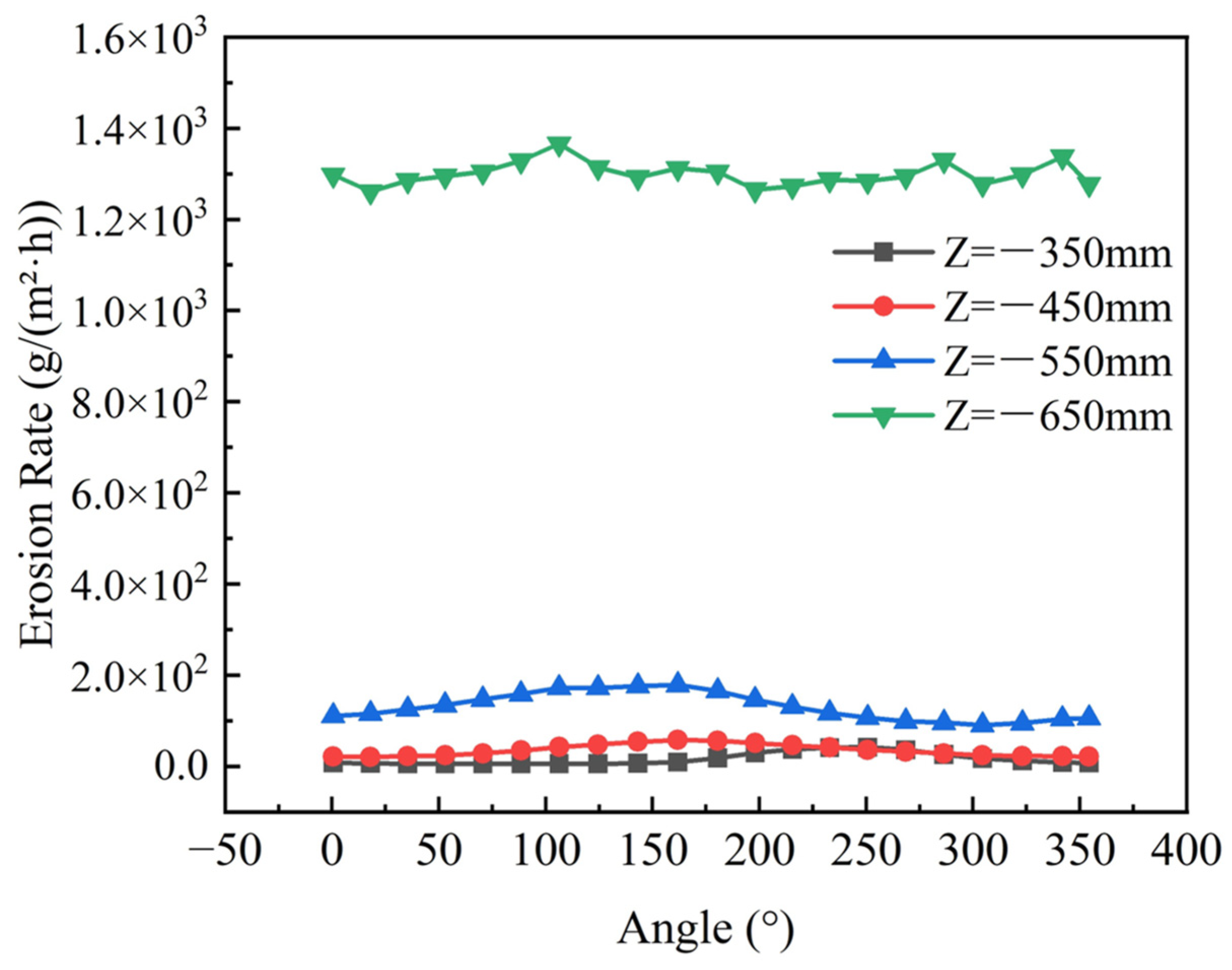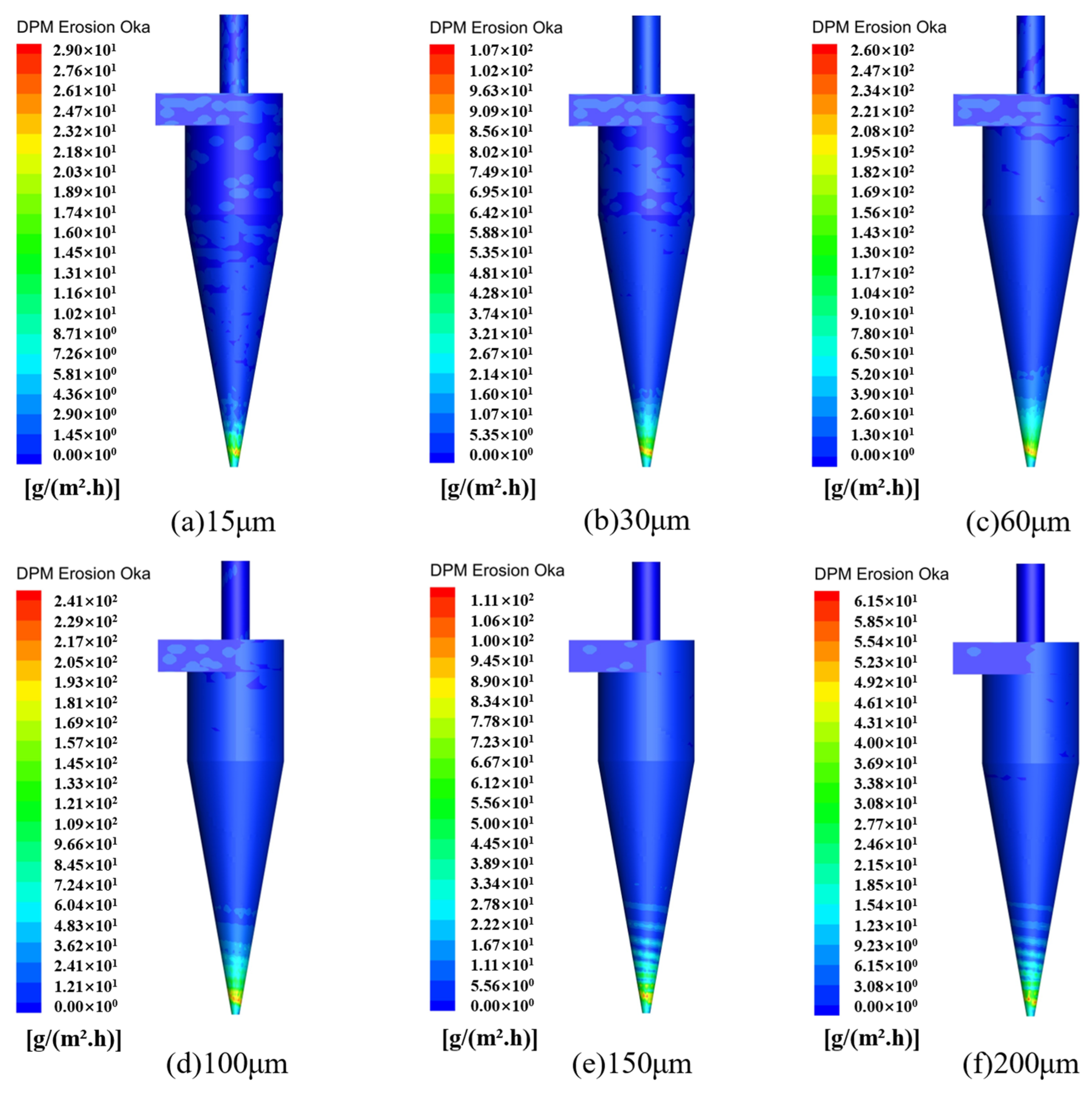 - Wang, Y.; Zeng, T.; Xu, Y.; Liu, S.; An, J.; He, Y.; Xiao, X. Effect of Solid Particles on the Erosion Wear Characteristics of Hydrocyclone. Fluid Mach. 2019, 47, 50–55+6. [Google Scholar]