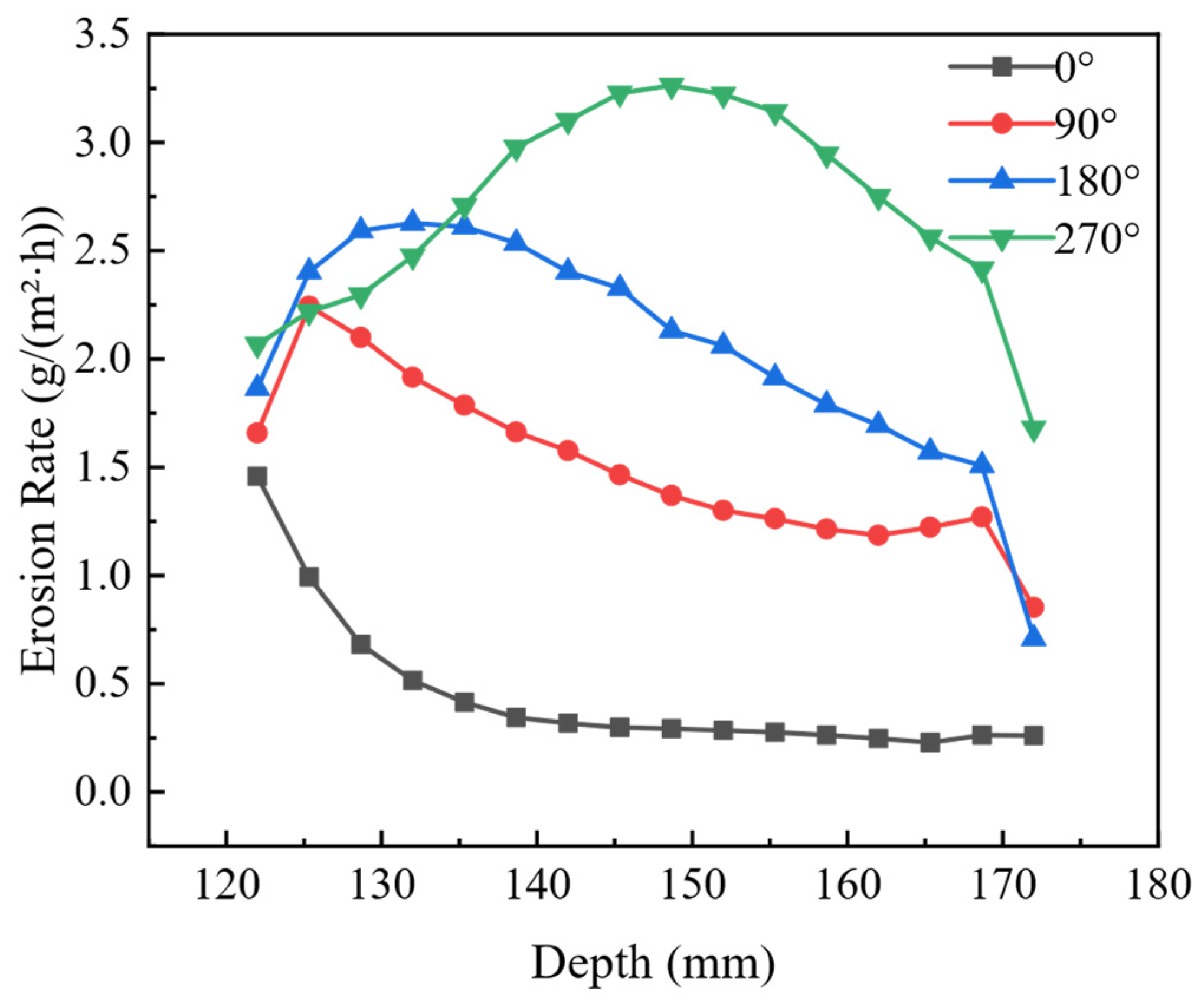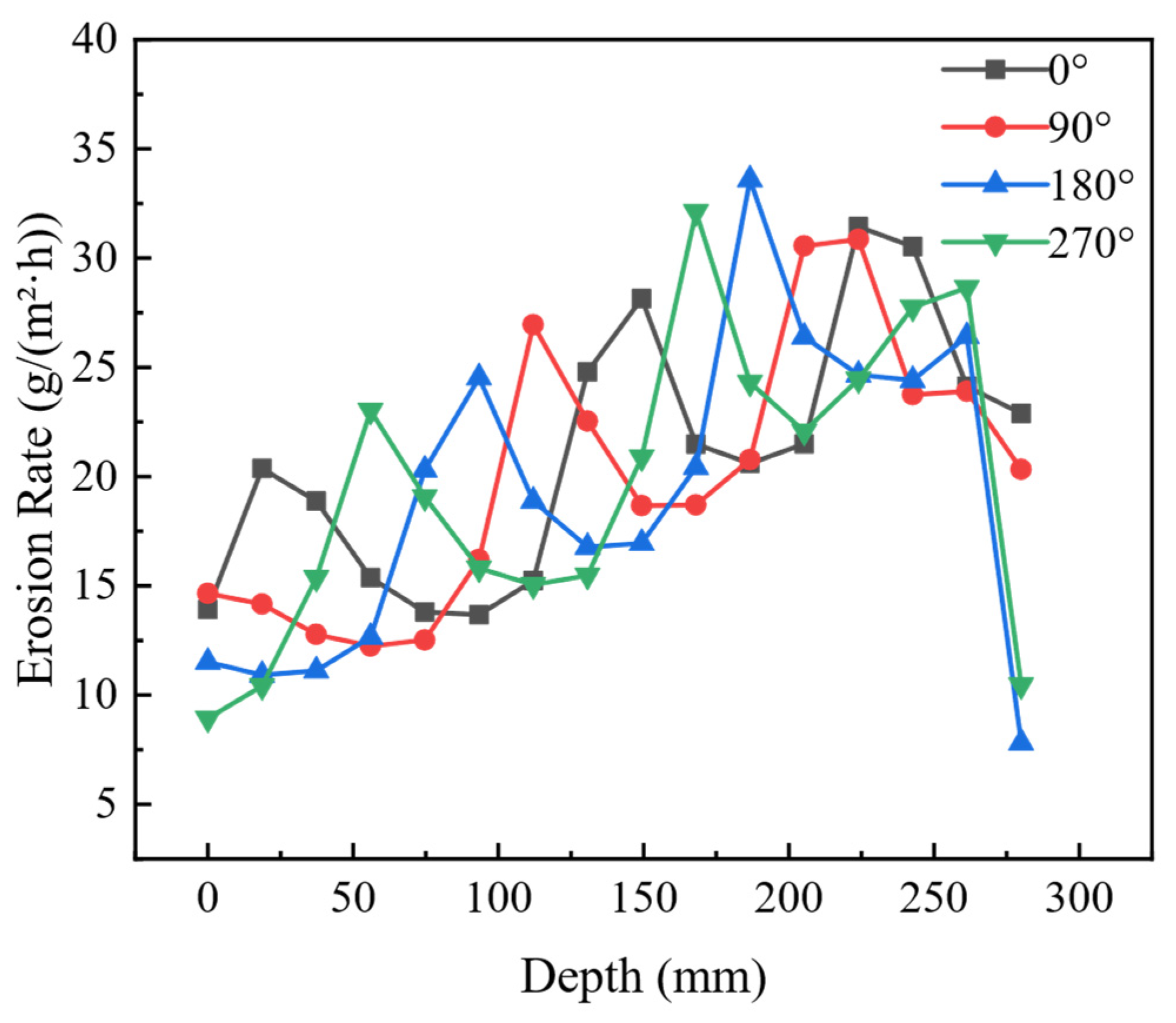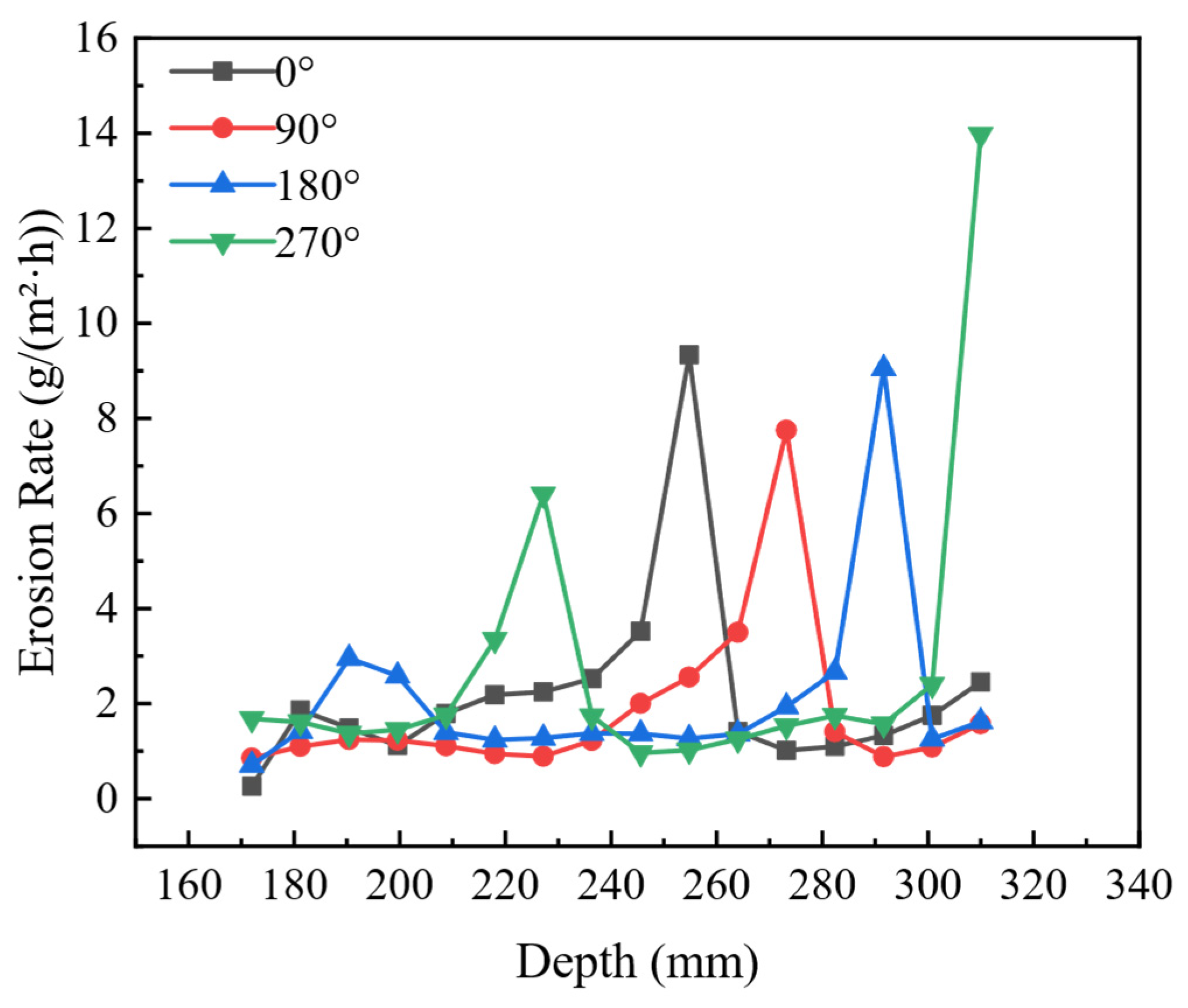VGAS (m/s) | Sand Size (μm) | Sand Rate (Kg/Day) | Erosion Rate (mm/Year) | Max Erosion Location (°) | |
