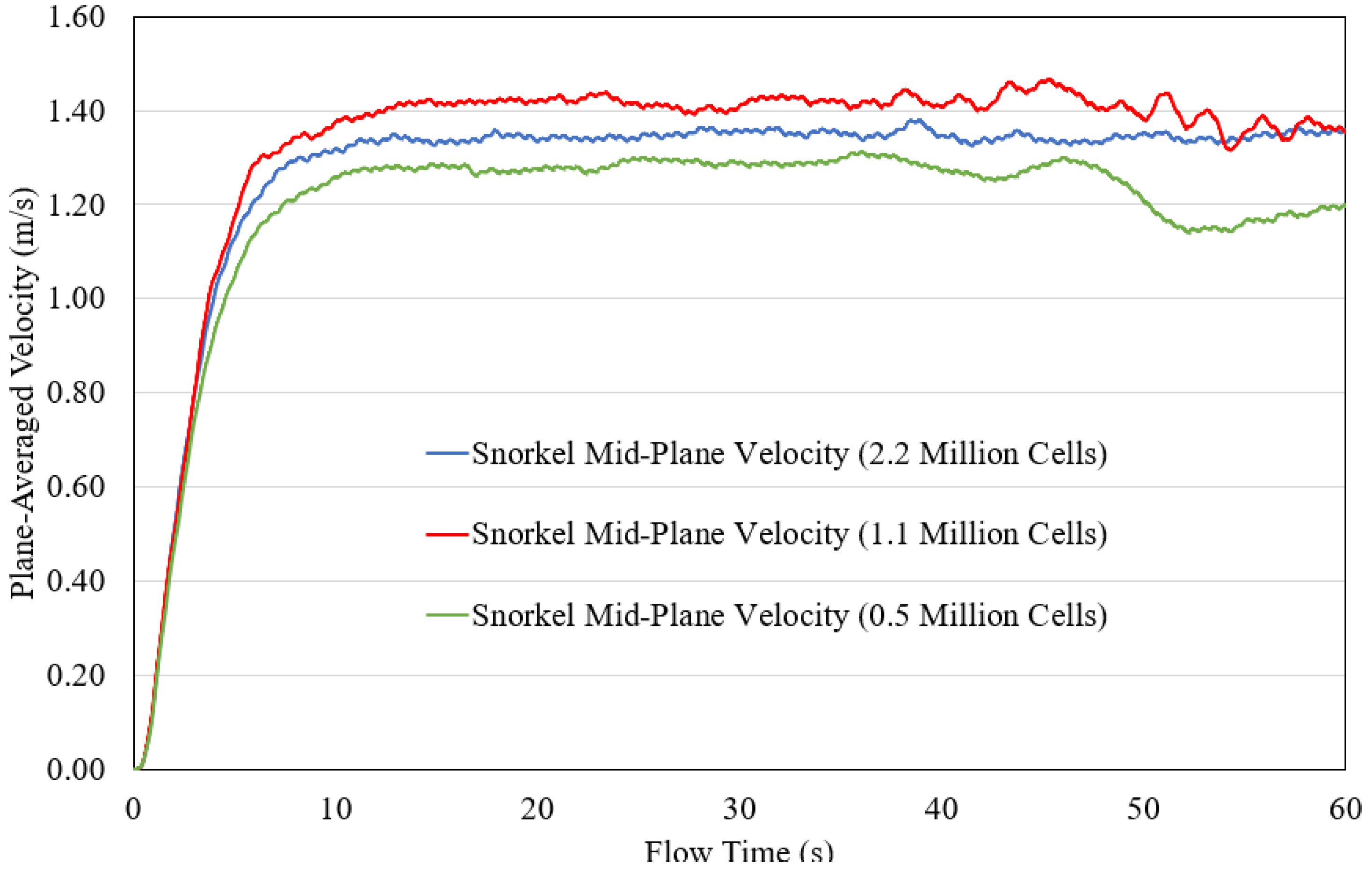 To make sure the element size did not significantly influence the results, a mesh convergence study was performed. Three models were created: one with 2.2 million cells, another with 1.1 million cells, and a coarser mesh model with 0.5 million cells. The plane-averaged velocities at the center of the snorkels were compared among all three models to understand how results changed with the number of elements. To help visualize the data, an exponential moving average of the velocity values was calculated using a smoothing factor of 0.001 and plotted, as shown in