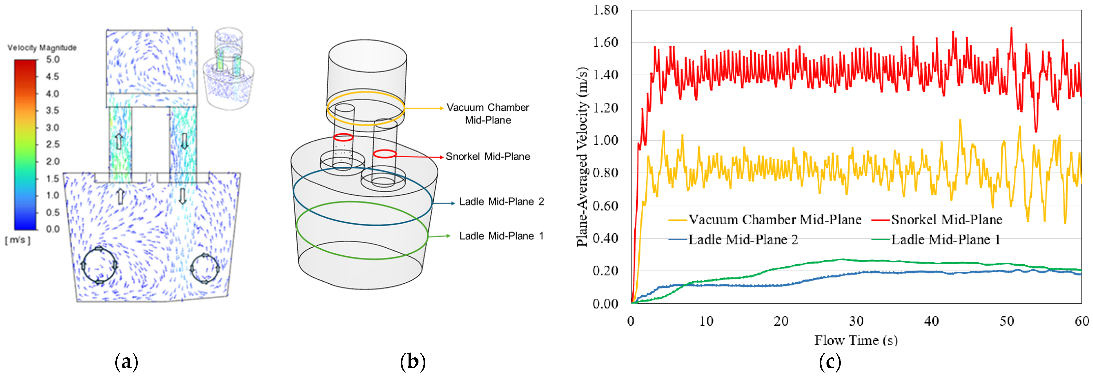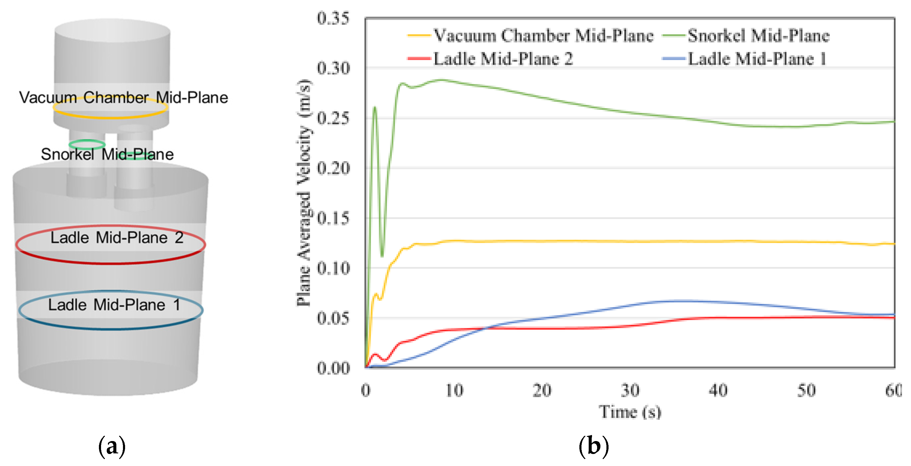 An initial fluctuation of velocity was observed across all the planes for the first 1.8 s, followed by a gradual increase that reached a steady state after 40 s, indicating a pseudo-steady condition. The highest velocity occurred at the snorkel mid-plane due to the high-velocity argon gas injection in the up-snorkel. However, very minimal velocity changes were observed in the mid-planes within the ladle, indicating that significant fluid motion occurred primarily within the snorkels and the vacuum chamber.