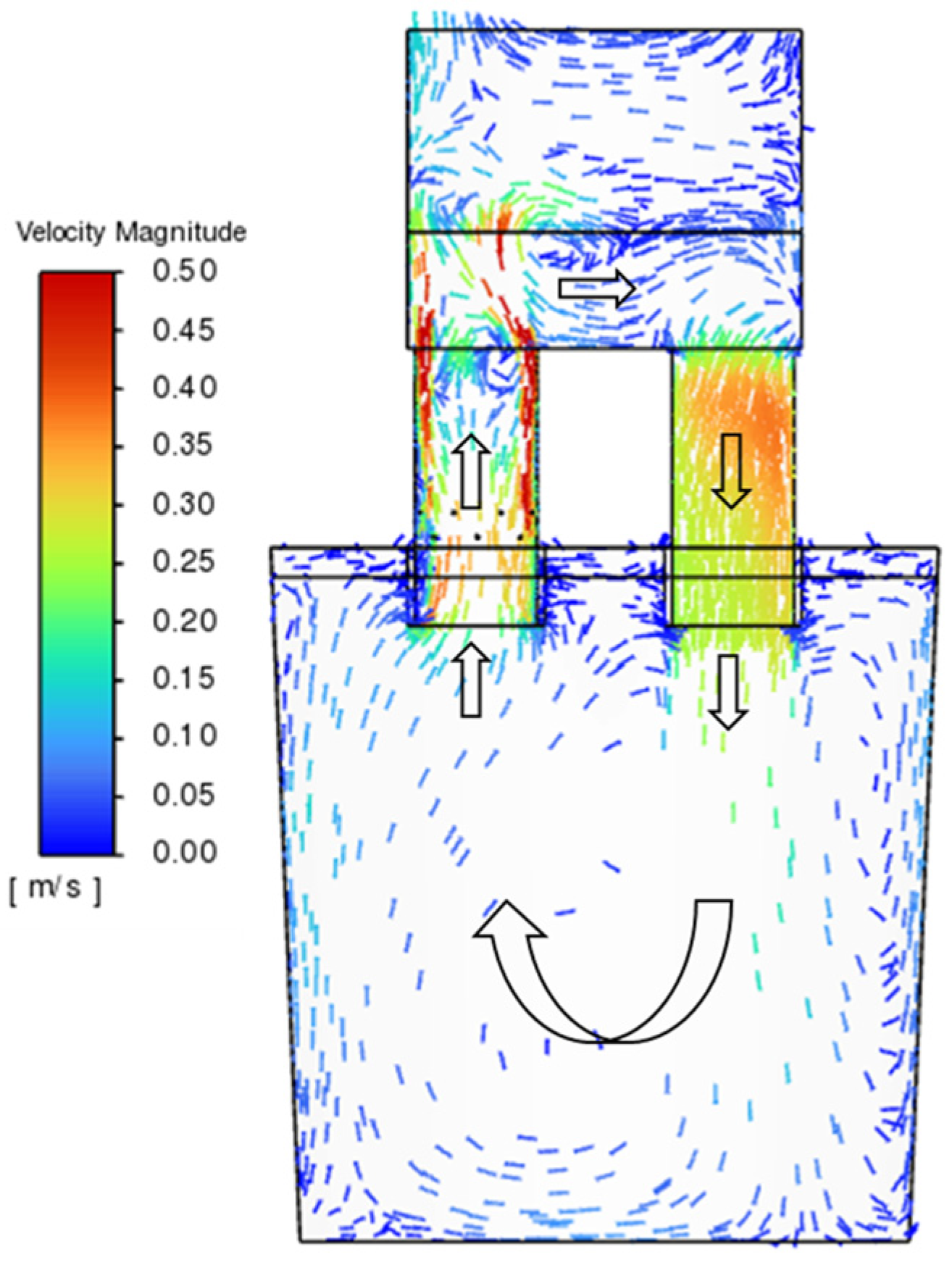 To understand the velocity field inside the system, the velocity vectors were generated on a vertical plane passing through the vacuum chamber, snorkels, and ladle, as shown in
